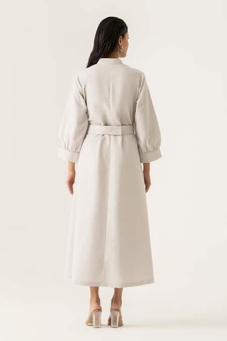 Grey midi dress featuring delicate floral embroidery on the bodice and a belted waist. Designed with full sleeves and a button-down front.