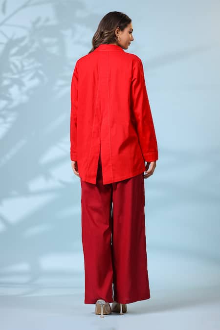 Red Cotton Embroidered Resham Thread Collar Shirt And Pant Set
