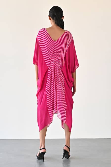 Raspberry pink georgette dress featuring a front gathered panel in leheriya pattern with placement beads, sequin, and thread embellishment. Paired with a sweetheart neck inner slip, this dress has batwing sleeves and an asymmetric hem.