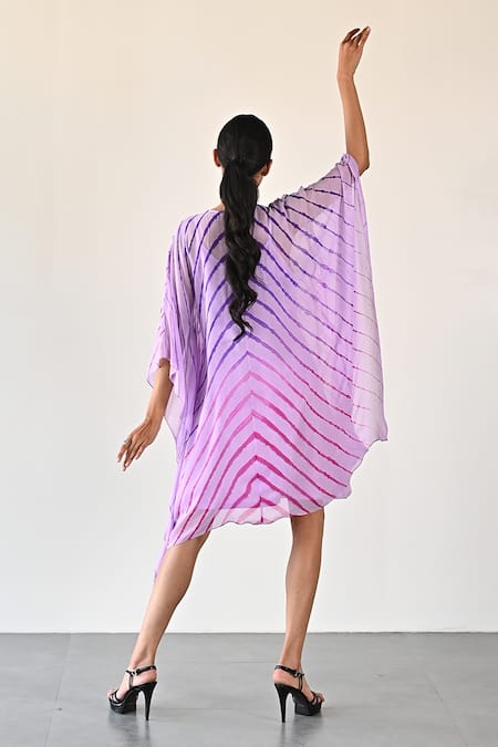 Purple georgette dress featuring an all-over leheriya pattern with bead, sequin, and thread embellishments. Paired with a sweetheart neck inner slip, it has batwing sleeves and a front tasselled tie-up closure.