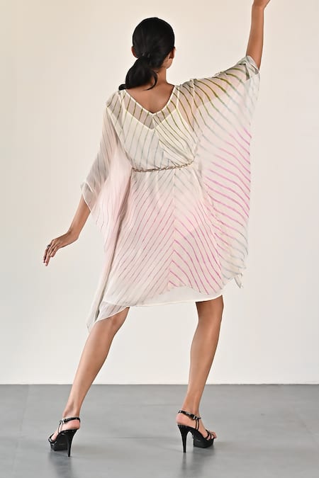 Off White Georgette Leheriya Pattern And Embellished Beads Dress V Neck Tunic