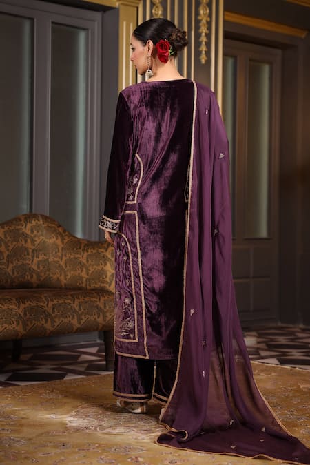 Wine Velvet Beads, Sequins, Embroidery V-neck Mughal Floral Kurta Set