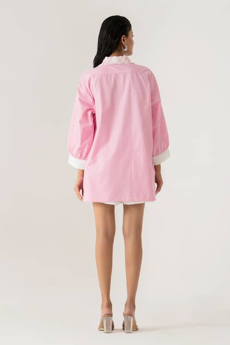 Relaxed-fit pink striped shirt with abstract white embroidery. Paired with crisp white shorts featuring elastic closure.