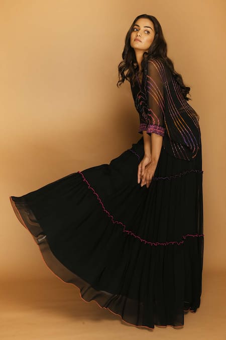 Black kaftan tunic with all-over multicolored stripes and V-neck. Comes with lehenga.