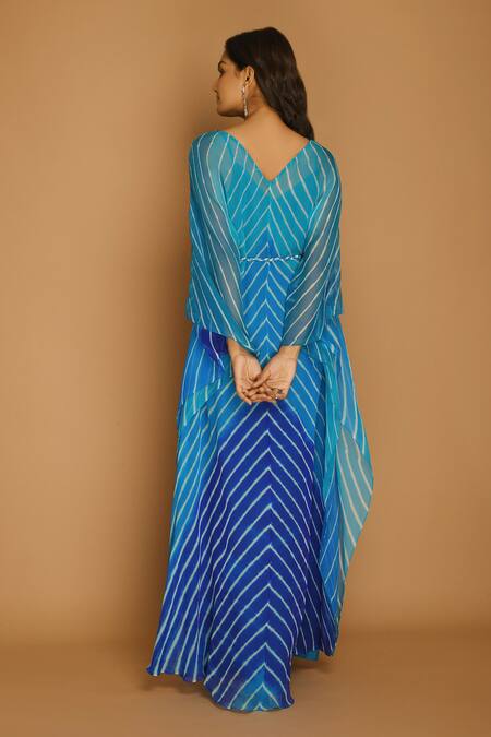 Blue-turquoise kaftan with all-over chevron print and V-neck. Comes with braided belt.