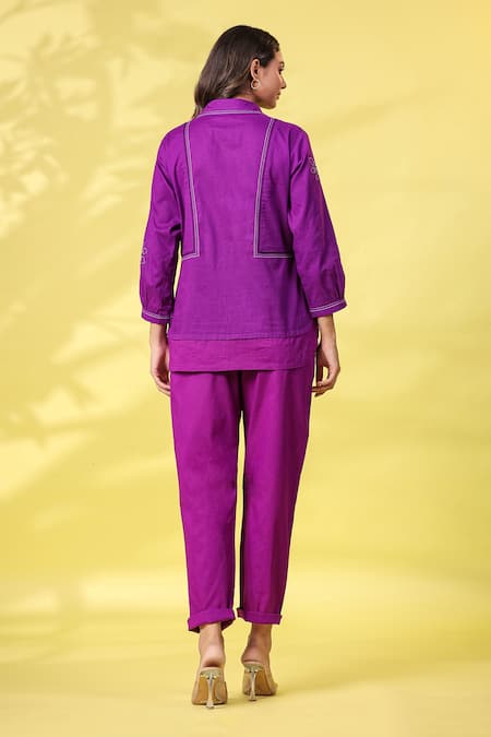 Purple Cotton Embroidered Resham Thread Collar Work Top And Pant Set