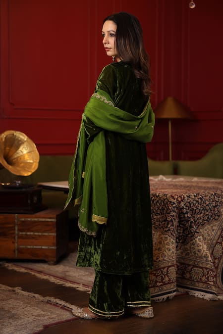 Green Velvet Embroidery, Sequins, Beads Plunge Neck Resham Work Kurta Set