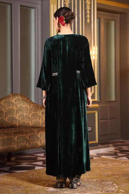 Green velvet kurta featuring intricate resham, sequin, thread, and bead embroidery. Paired with matching embroidered pant, enhancing the overall elegance.