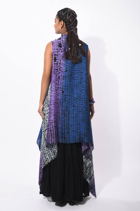 Black and blue shibori jacket with asymmetric hem. Paired with embroidered blouse and skirt.