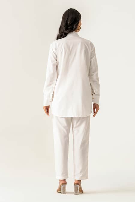 Off White Cotton Embroidery, Beads, Sequins Collared Co-ord Set With Beige