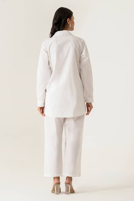 White Cotton Embroidery, Beads, Sequins Collared Co-ord Set With Peacock