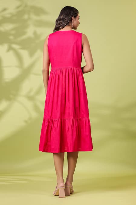 Dark pink midi dress featuring a V neck and resham thread embroidered yoke. Comes with a matching belt for added style.