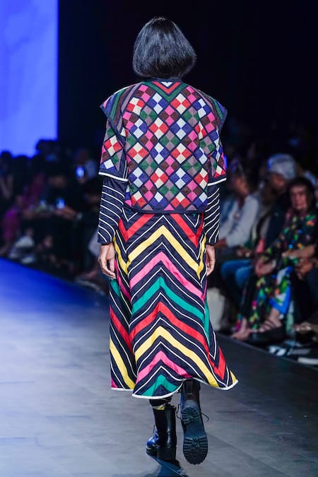 Checkered bead work appliques on sleeves, Multi-colored chevron patterns