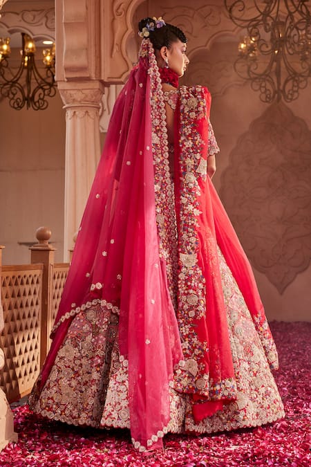 Red Silk, Organza Beads, Sequins, Embroidery, Floral Garden Bridal Lehenga Set