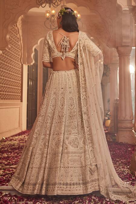 Mughal floral patterns with intricate beadwork, Back tie-up closure on the blouse, Attached cancan for added volume