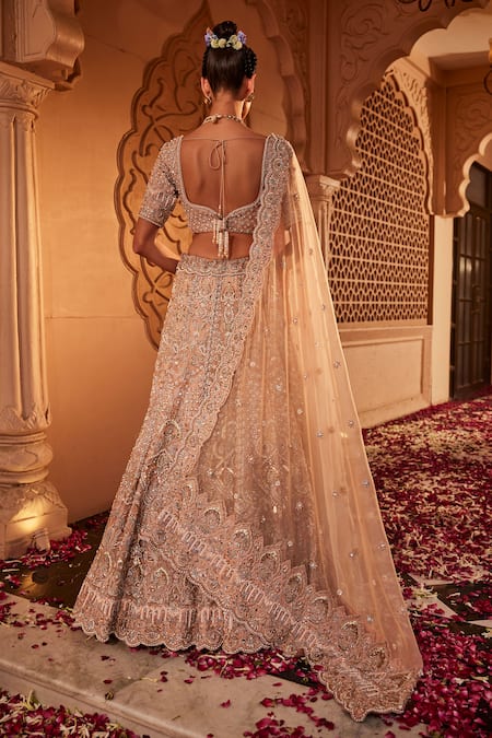 Intricate floral embroidery with cutdana and mukaish work, Scalloped border on dupatta, Attached cancan lining in lehenga