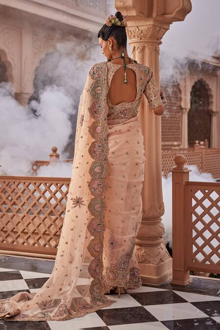 Beige organza saree featuring intricate embellishments with cutdana, nakshi, sequin, bead, thread, zari, and dabka work. Paired with a back cut-out embellished padded blouse.