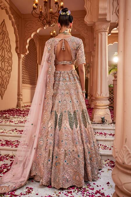 Back cut-out blouse design, Intricate patchwork of embellishments, Side tassel detailing on lehenga
