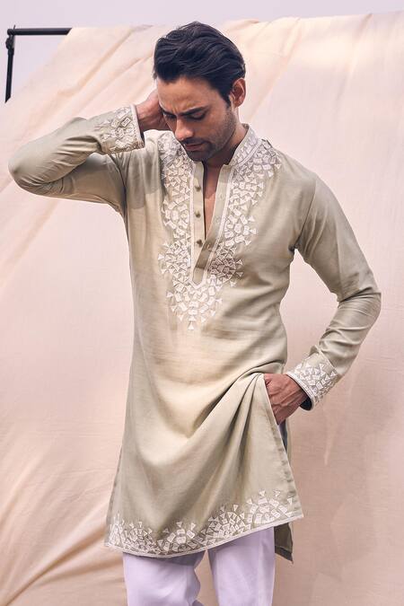 White geometric applique embroidery on kurta, Mandarin collar design, Full sleeves with embroidered cuffs