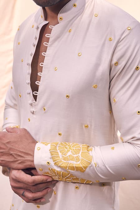 Ivory kurta featuring yellow floral applique and mirror embroidery. Paired with off-white pants.