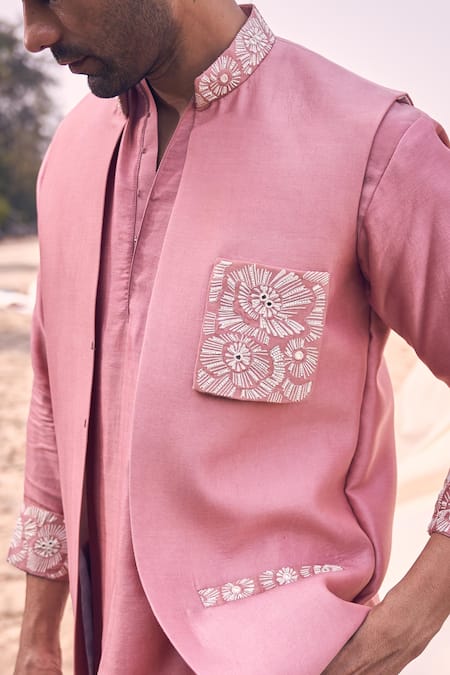 Pink bundi featuring thread, cutdana, and mirror placement embroidery. Paired with an embroidered kurta and white pant.