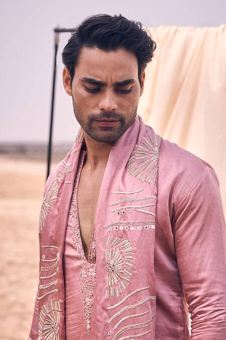 Pink kurta featuring a plunge V neck, full sleeves, and gold thread mirror embroidery on the placket. Paired with a matching dupatta and white pant.