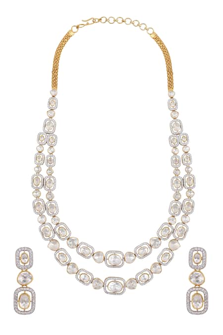 Gold Plated Cut Work, Diamonds Rumi Gleaming Polki Layered Necklace Set