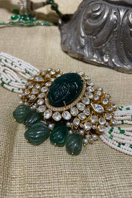Intricate carved green stone centerpiece, Fresh water pearl detailing, Diamond stone embellishments