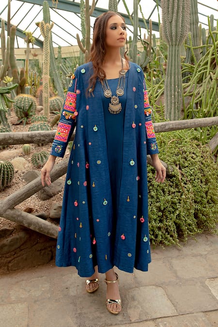 Blue dress featuring full sleeves, square neckline, and a front tie-up belt. Paired with a long jacket adorned with multi-colored floral motifs, danka, thread, and mirror embroidery.