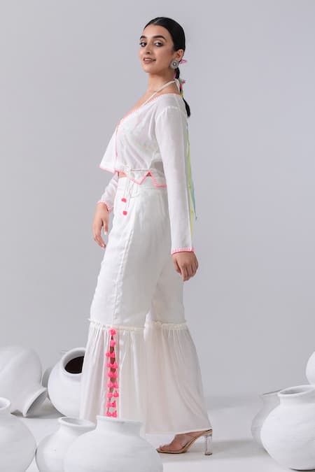 Ivory full sleeve jacket featuring pink thread embroidery and pom pom lace detailing. Paired with a multi-colored thread embroidered bralette and pink tassel ornamented sharara pant.