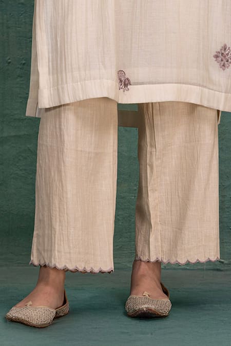 Beige kurta featuring machine embroidery and organza back with hand scalloping. Paired with a matching pant for a cohesive look.