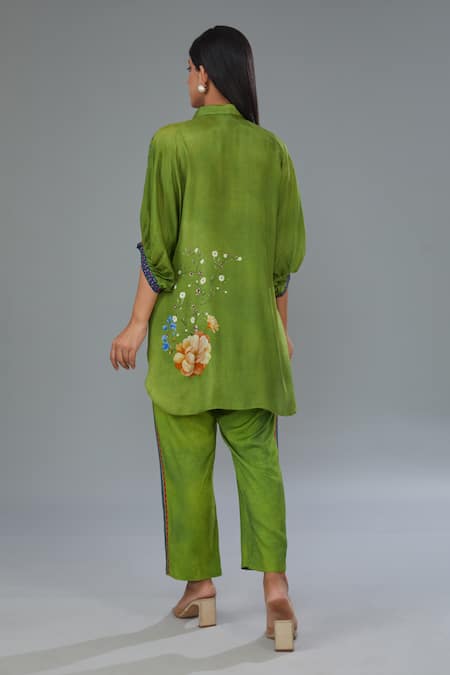 Green Cotton, Silk Embroidery Collared Botanical Print Shirt Kurta And Pant Set
