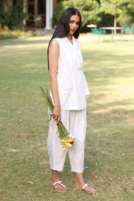 White Cotton V-neck Overlap Jacket And Pant Co-ord Set