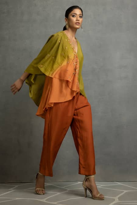 Green asymmetric hem flared top featuring thread and bead embroidery. Paired with a coordinating pant in orange.