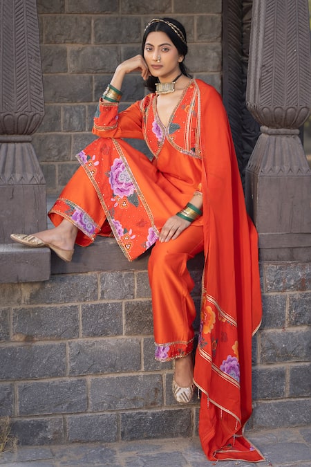 Orange kurta featuring floral placement print on the border with zari, bead, and sequin embroidery. Paired with a border printed pant and a matching dupatta.