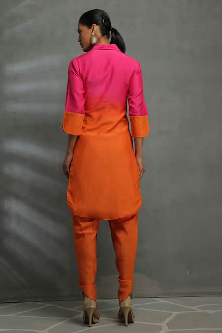 Pink and orange tunic featuring a pointed collar, three-quarter sleeves, and floral thread and bead embroidery. Paired with an ombre dhoti pant for a stylish fusion look.