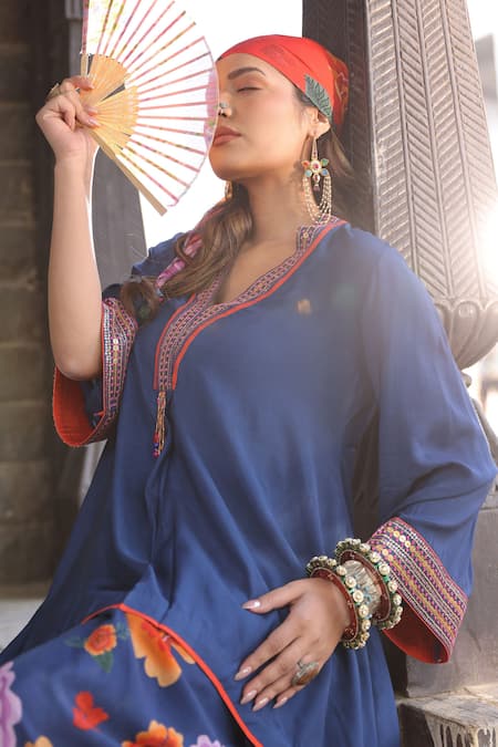 Blue kurta featuring a leaf neck with sequin, thread, and bead embroidery. Paired with a floral printed dhoti skirt.