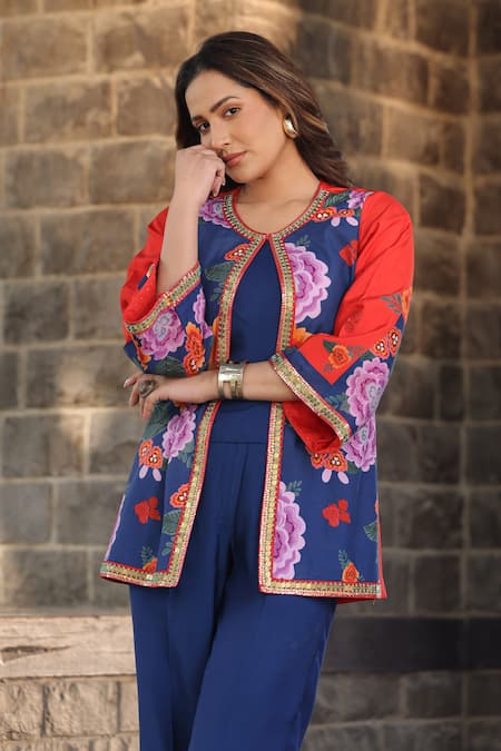 Buy_Kahani Lush_Blue Cotton, Silk Beads Round Neck Floral Print Embroidered Jacket Pant Set _at_Aza_Fashions