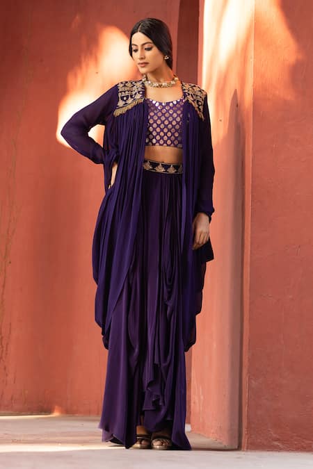 Purple blouse featuring floral woven design paired with a draped dhoti skirt and an open shrug. The shrug is adorned with zardozi, aari, bead, and thread embroidery in a floral pattern.