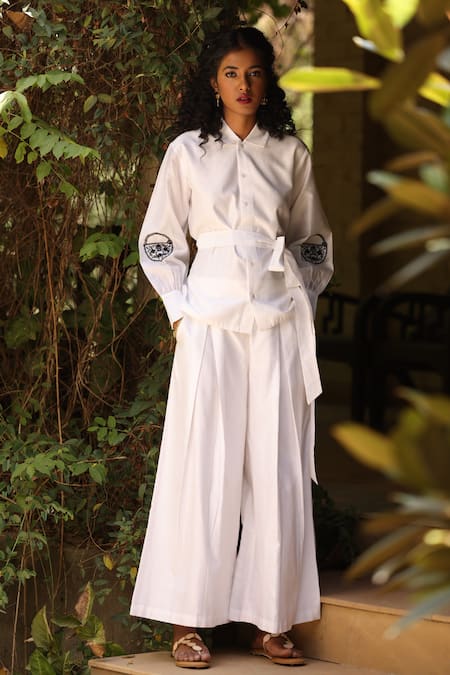White Chanderi Silk Embroidery Melody Shirt And Pleated Palazzo Co-ord Set