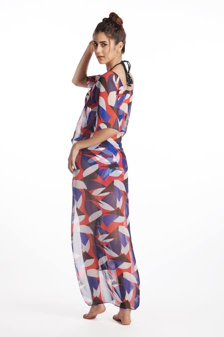 Red One Shoulder Scarlet Geometric Print Kaftan Cover Up
