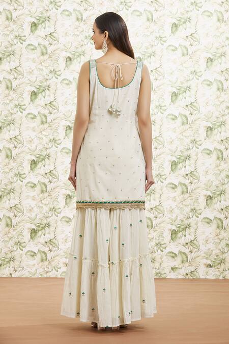 White Cotton, Organza Sequins, Beads, Gota Patti Embroidered Kurta Gharara Set