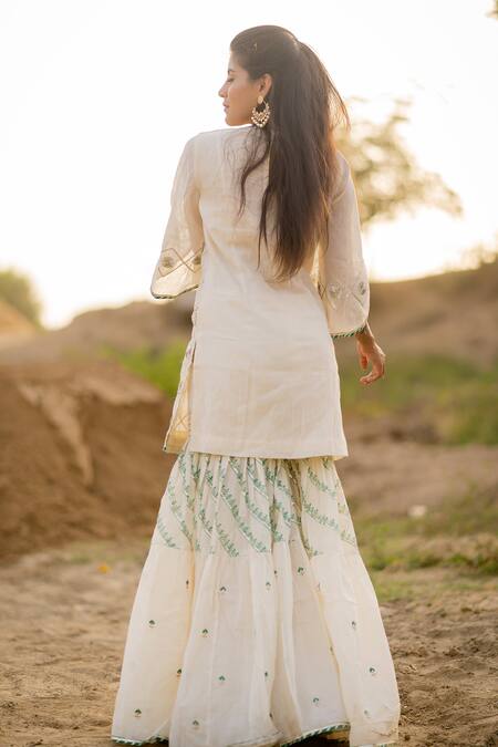 Off white short kurta with all-over gota patti work in checkered pattern & flared sleeves. Comes with tiered sharara pants & block print dupatta.