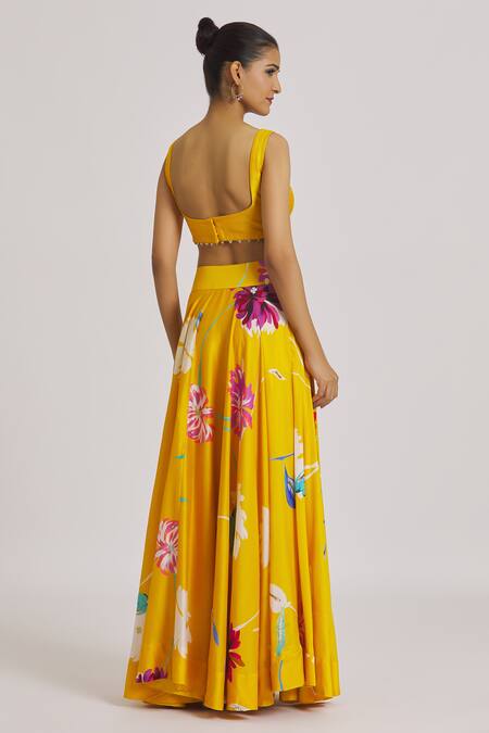 Yellow lehenga featuring floral prints and embroidery detailing. Paired with a sleeveless blouse and embroidered dupatta.