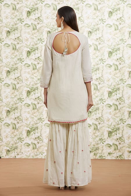 White embroidered kurta featuring a notched round neck, three quarter sleeves, and back tasselled tie-up. Paired with a gharara with a half elasticated waistband and an organza dupatta adorned with gota embroidery.