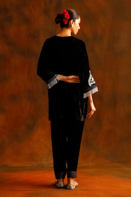 Black velvet kurta featuring bloom embroidery with zari and pearl highlights. Paired with a matching salwar and attached lining.