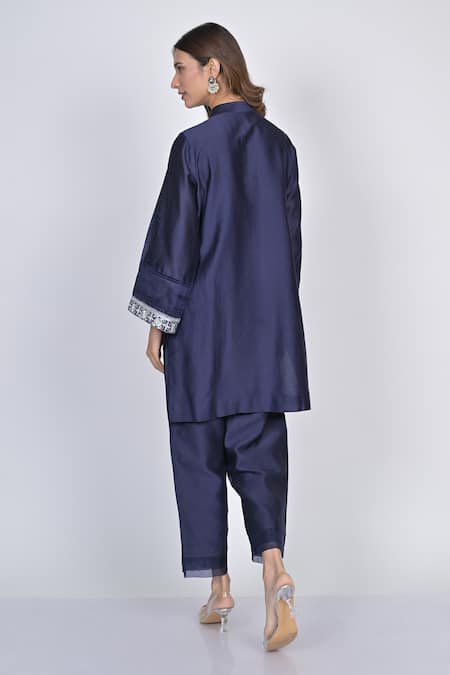 Blue Chanderi, Organza Mirrors, Embroidery Mandarin Collar Kurta Pant Set