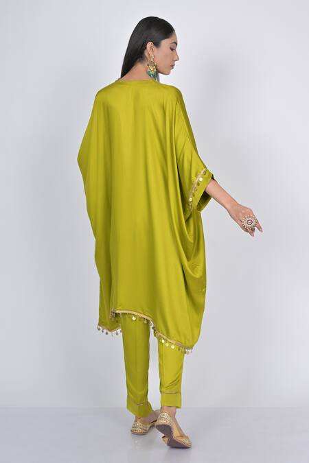 Lime green kaftan featuring placed multicolor thread, mirror embroidered floral vine patterns, and coin tassels. Paired with matching pants that include an attached lining.