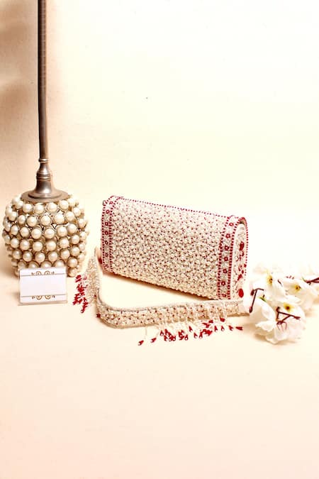 Rhinestones and white pearls embellished all over, Detachable strap for versatile use