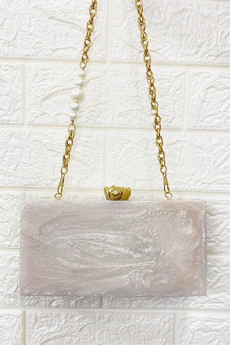 White rectangle clutch bag featuring pure mother of pearl and resin embellishments